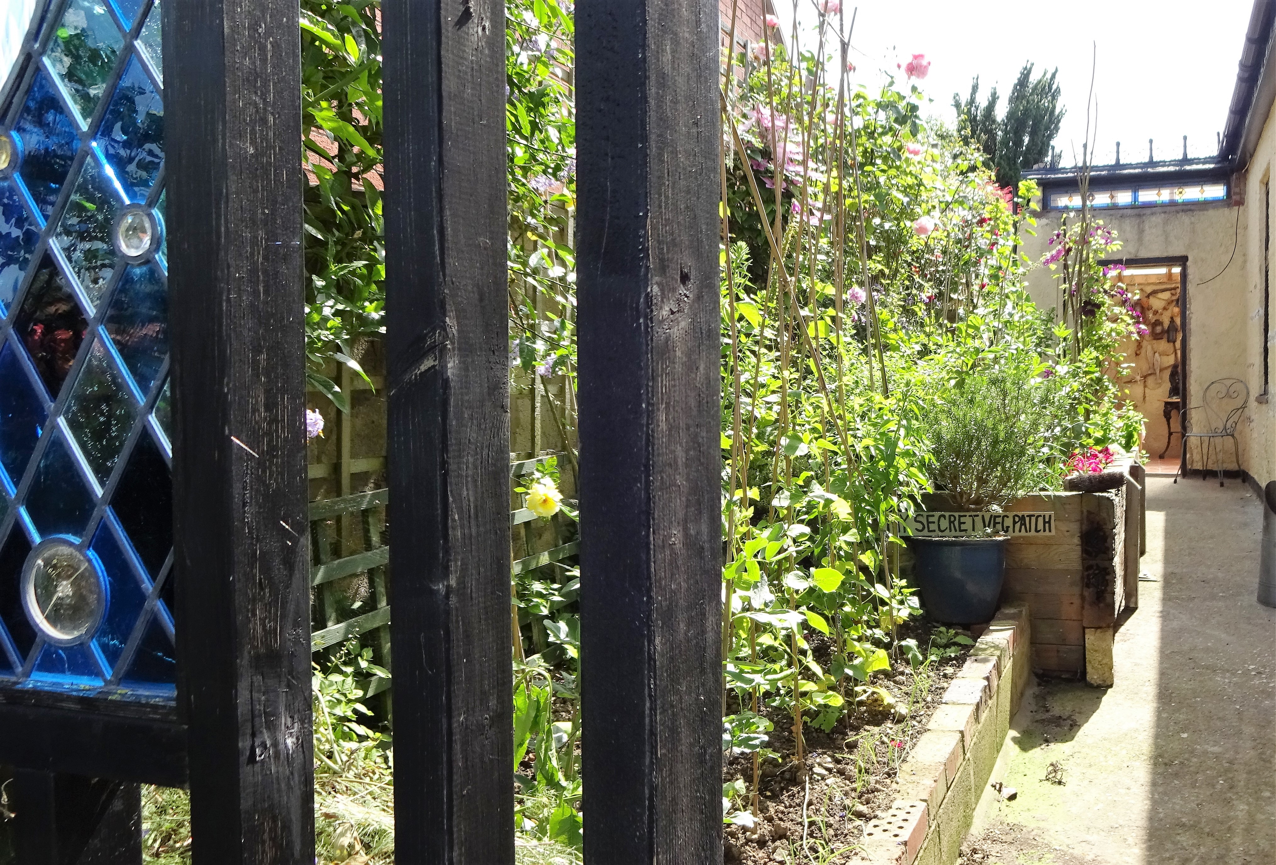 I noticed that the sun was on the raised soil bed most of the day, this and the fact that the veg patch is enclosed by walls on three sides and a decorative high fence with a beautiful eclipse stain glass window on the fourth side – meant that a sort of micro-climate was created.